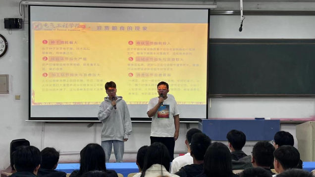 珍惜粮食宣讲会正式开始。首先由主持人介绍本次评委并宣布珍惜粮食宣讲会正式开始。随即双创部部长周泽鑫学长为我们展示了一些常见的粮食作物并对其进行介绍,接着为我们介绍了目前我国粮食形势的严峻以及我国粮食浪费的情况,然后为我们列举了一些浪费粮食的现象,如:种子消耗偏大、储藏环节损失严重、加工环节损失与浪费加大等现象。接着由实践部副部长赵梦楠学长为我们讲述了粮食的作用以及一些名人爱惜粮食的故事,同学们感触颇深。接着由宣传部部长张月秋学长列举了一些珍惜粮食的小做法,如:适量订餐避免剩餐,减少浪费,不攀比,以节约为荣,浪费为耻;吃饭时吃多少盛多少,不浪费剩饭剩菜,看到浪费现象勇敢地起来制止,尽力减少浪费;做节约宣传员,向家人、亲戚、朋友宣传浪费的可怕,积极监督身边的亲人和朋友,及时制止浪费粮食的现象等。最后宣传部部长张月秋学长,双创部部长周泽鑫学长,实践部副部长赵梦楠学长一同希望同学们做到珍惜粮食、节约粮食。