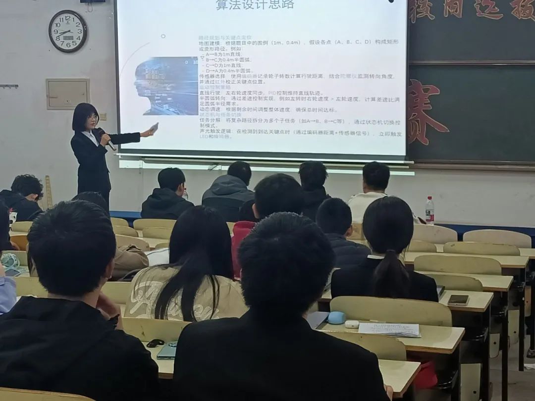 本次初赛分为PPT展示和现场答辩两个环节。在PPT展示环节中,各参赛队伍围绕作品的功能性、创新性、技术难度等方面进行全面阐述。选手们逻辑清晰、表达流畅,部分队伍还播放了已经初步完成的赛题小车演示视频,充分展现了扎实的理论基础和出色的动手能力,赢得现场阵阵掌声。