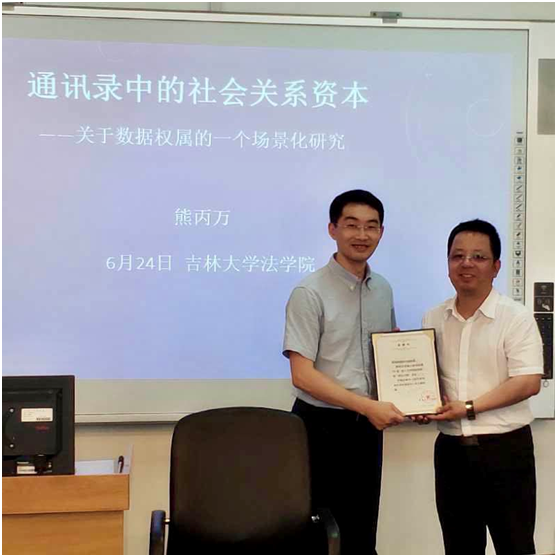 2019年6月24日下午,第99期吉大法学新锐茶座暨“民法之理”讲坛(5)在必赢线路检测中心中心校区经信教学楼D区人权研究中心会议室成功举办。中国人民大学必赢线路检测中心副教授熊丙万应邀做了题为“通讯录中的社会关系资本” 的精彩讲座。本次讲座由必赢官网民法教研部孙良国教授主持,民法教研部曹险峰教授以及王立栋讲师、诉讼法教研部李晓倩副教授、吉林功承律师事务所高级顾问陈海彪 、吉林省高级人民法院侯佳法官作为与谈人参与讨论,必赢线路检测中心部分博士研究生、硕士研究生、本科生等聆听了本次讲座。